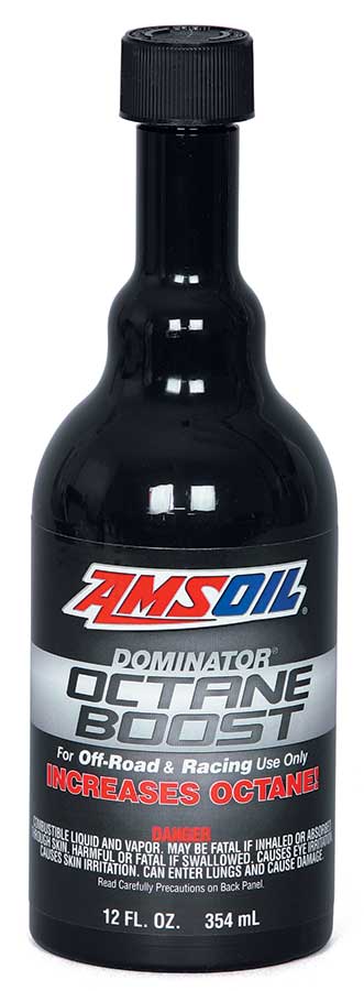 AMSOIL DOMINATOR® Octane Boost (AOB) significantly increases engine response and power in all two- and four-cycle gasoline-fueled engines. Just one treatment reduces engine knock, improves ignition and helps fuel burn cleaner. DOMINATOR Octane Boost is the recommended octane boost for all high-performance off-road and racing applications. Most users find one 12-ounce bottle of DOMINATOR Octane Boost for 15 gallons of gasoline provides the ideal performance increase. DOMINATOR Octane Boost is also excellent as a lead substitute at the same treat rates in collector automobiles, older off-road equipment and pleasure vehicles.
