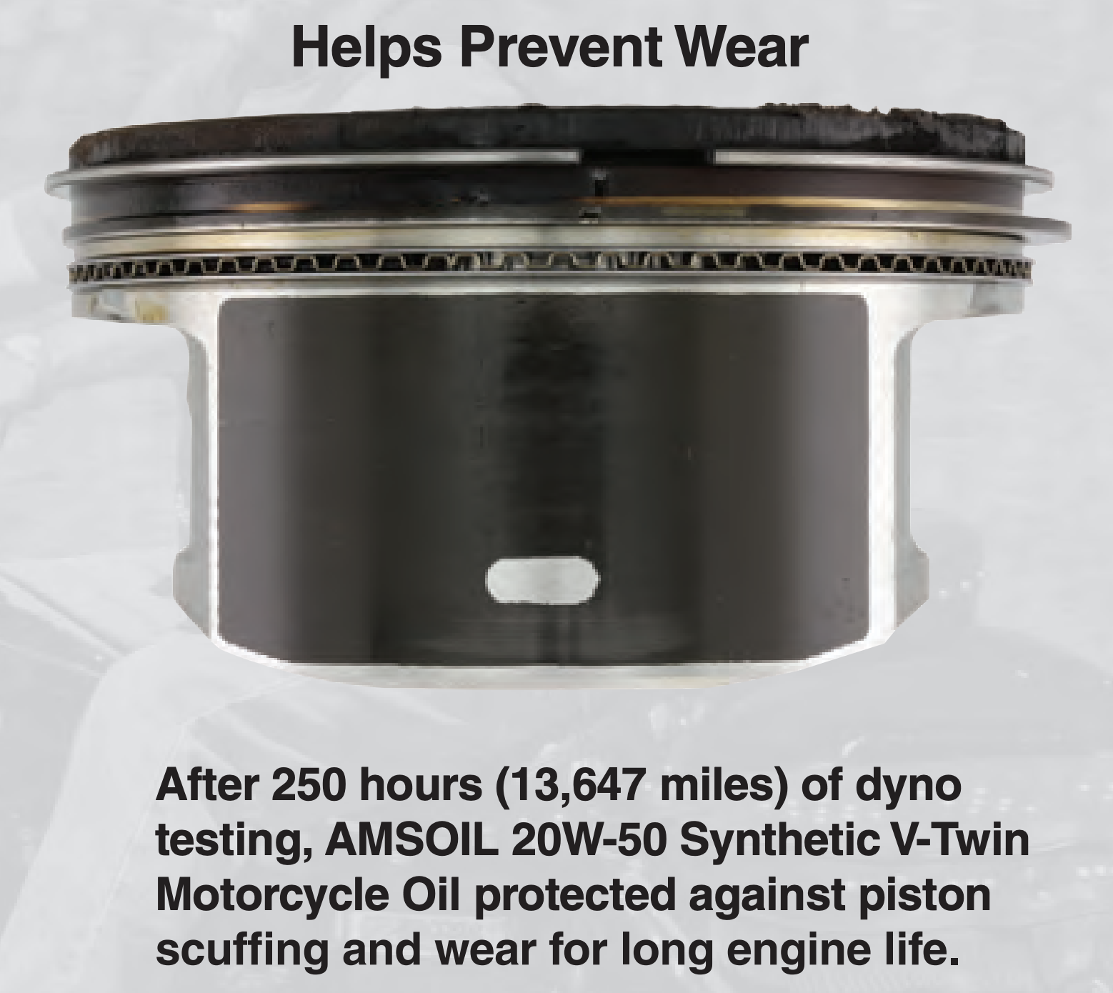 AMSOIL Synthetic V-Twin Motorcycle Oil contains a heavy treatment of anti-wear additives to reduce wear regardless of the operating conditions. It is thermally (heat) stable and contains maximum levels of oxidation inhibitor additives. After 250 hours (13,647 miles) on an engine dyno, AMSOIL Synthetic V-Twin Motorcycle Oil eliminated piston scuffing and wear for long engine life and maximum power (see image).