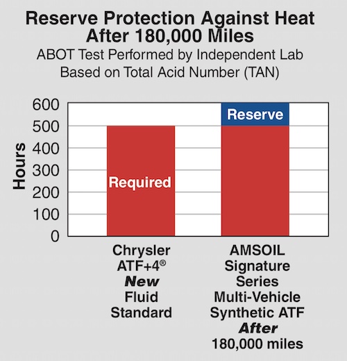 To demonstrate its effectiveness in severe service, Signature Series Multi-Vehicle Synthetic ATF was installed in Las Vegas taxi cabs. The vehicles routinely encountered demanding stop-and-go driving loaded with passengers and cargo, while the desert environment presented extremely hot ambient temperatures, placing enormous strain on the fluid. Following 180,000 miles, a transmission was selected for analysis. The Aluminum Beaker Oxidation Test (ABOT) is an industry standardized test used to determine a transmission fluid's oxidation resistance, which is a good indicator of its service life. Testing by an independent, third-party lab revealed that after 180,000 miles in severe service, Signature Series Multi-Vehicle Synthetic ATF resisted oxidation longer than required for new fluid to meet the Chrysler ATF+4