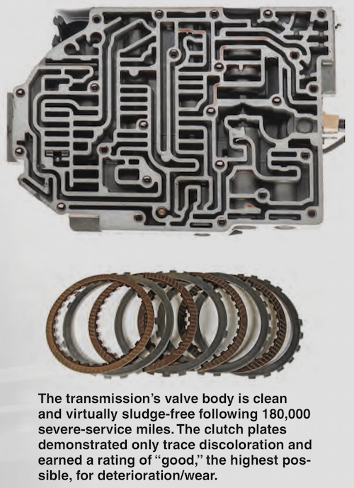 specification (see graph). Internal components, including the valve body and clutch plates (pictured), were virtually free of damaging sludge, deposits and wear, confirming the lubricant's high level of protection for severe-service applications.